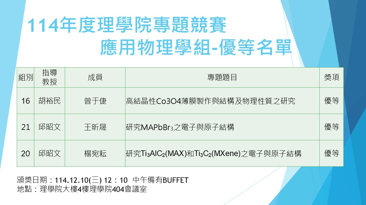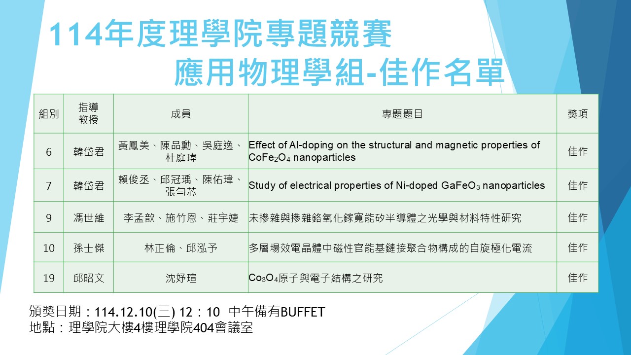 公告:114年度理學院專題競賽應用物理學系組獲獎名單