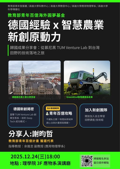 12/24(三)18:00於高雄大學理學院3F應物系演講廳辦理“德國經驗x智慧農業新創原動力”分享會,地點在高雄大學理學院3F應物系演講廳。